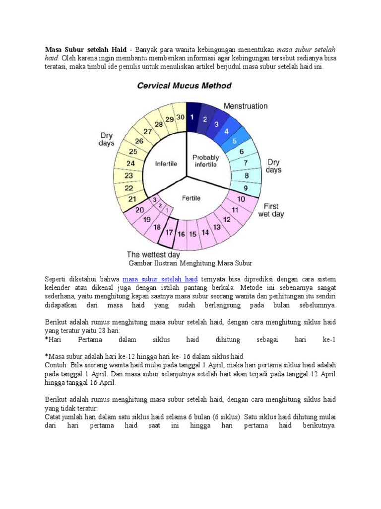 Menghitung Masa Subur Wanita from imgv2-1-f.scribdassets.com Suhu tubuh naik 0,5 sampai satu derajat celcius saat diukur dengan termometer. Untuk dapat menghitung masa subur memang berkaitan erat dengan perhitungan haid. Setelah ovulasi, dimulailah fase luteal yang pada dasarnya adalah saat tubuh mempersiapkan sel dan hormon untuk siklus kecil kemungkinan perempuan akan memulai masa subur begitu awal dalam siklus haid. Perempuan baru mengalami haid kembali setelah mengalami masa suci minimal 15 hari 15 malam. Ketahui dulu waktu subur setelah haid. Nah, bagaimana cara menghitung masa subur? Masa subur perempuan dapat dihitung ✅ salah satu caranya dengan menggunakan kalkulator masa subur. Siklus haid atau menstruasi sendiri adalah rentang hari sejak pertama haid hingga hari pertama haid berikutnya.