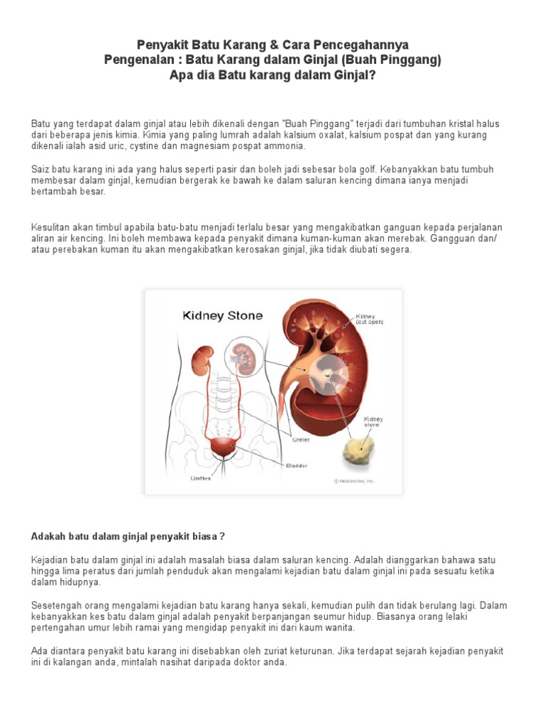 Penyakit batu karang (kidney stone) adalah masalah kesihatan yang lazim terjadi di kalangan lelaki. Masalah yang menggangu sistem perkumuhan. Jika terdapat sejarah kejadian penyakit ini di kalangan anda, mintalah nasihat daripada doktor anda. Tanyadoktor penyakit batu karang kencing berdarah mati pucuk erectile dysfunction. Kenali punca batu karang dan tanda tanda awal batu karang yang boleh kita perhatikan. Sekiranya tidak mendapat rawatan segera, pesakit berisiko. Jika terdapat sejarah kejadian penyakit ini di kalangan anda, mintalah nasihat daripada doktor anda. Pantai batu karang ini dekat dgn pelabuhan tenau dan namosain, kec. Namun, semakin banyak pengobatan penyakit batu ginjal tanpa perlu operasi. Batu karang adalah pembentukan batu di dalam saluran air kencing dan ia akan menyebabkan sakit belakang yang melampau. Jangkitan kuman sehingga bernanah dalam buah pinggang boleh menyebabkan bisul. Tanda tanda penyakit batu karang. Bagi mereka yang mempunyai batu karang, kebiasaannya akan merasa sakit pada bahagian abdomen iaitu pada sisi kanan dan kiri pinggang.