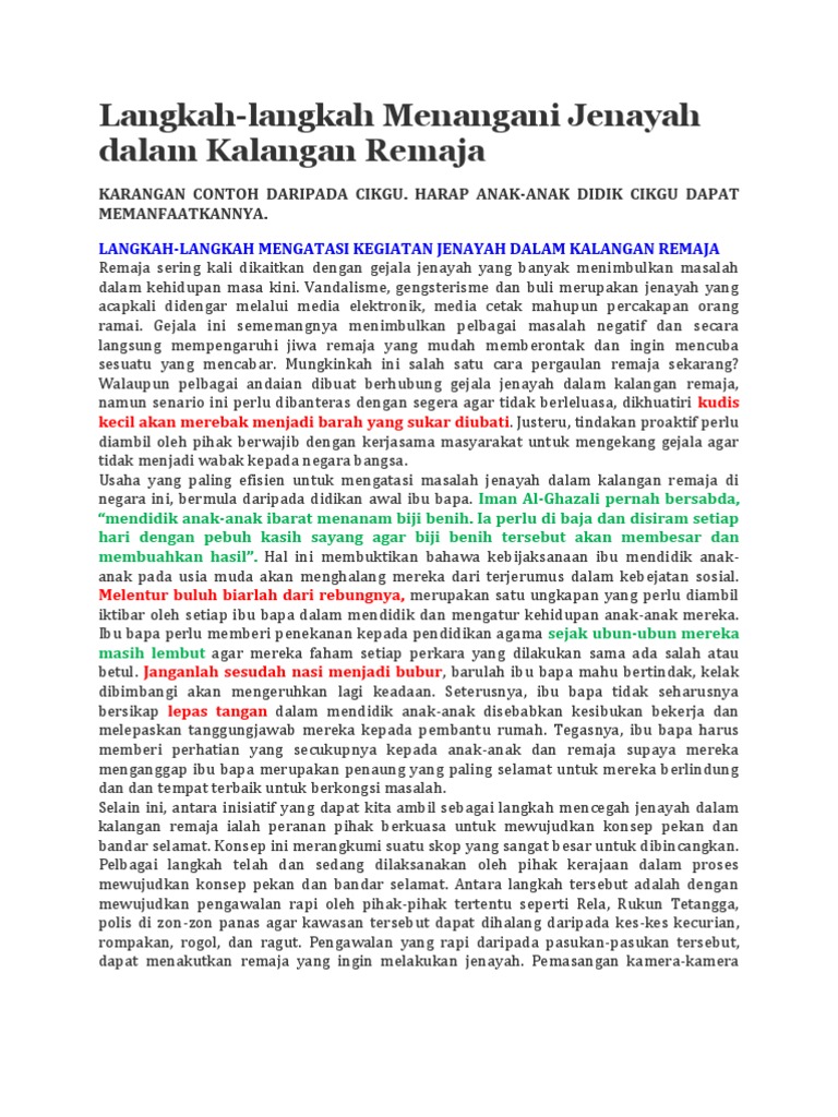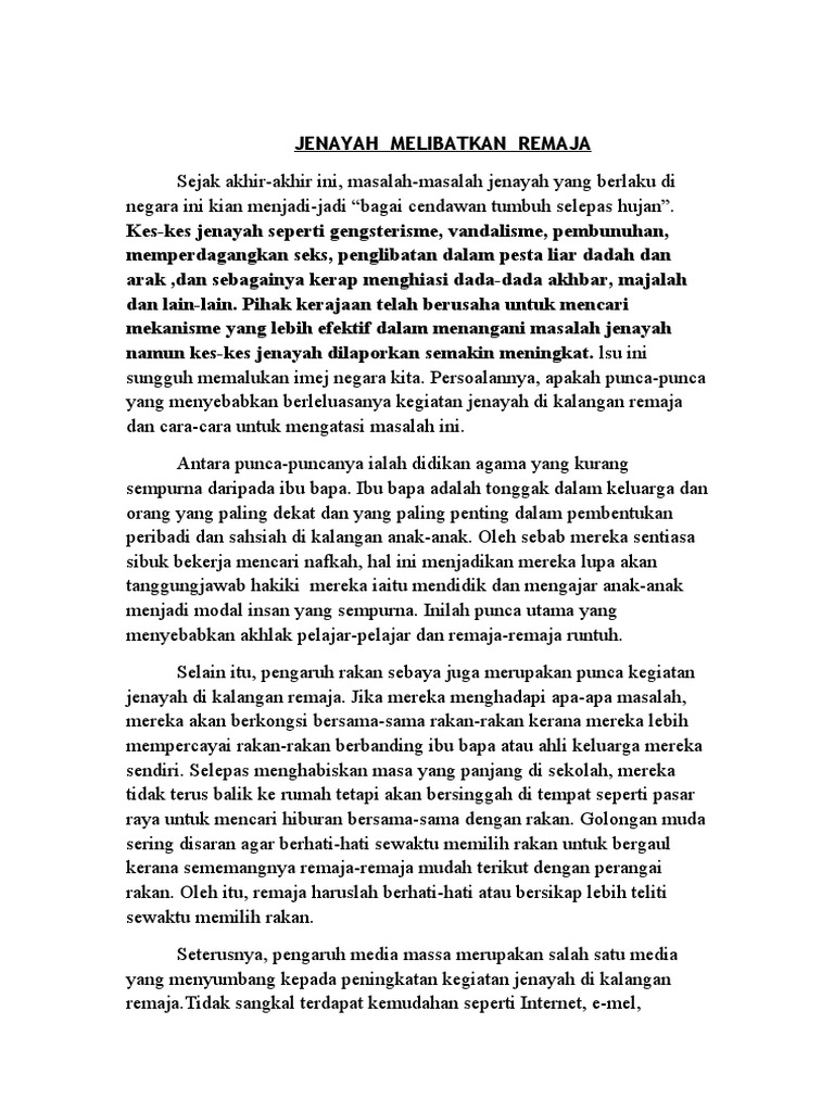 Kajian ketakutan terhadap jenayah yang dilakukan dalam kalangan pelajar juga adalah terhad. Dalam tahun 1995 ,1,895 kes melibatkan juvana. Antaranya ialah didikan yang kurang sempurna daripada ibu bapa dan keluarga. Masalah gejala sosial di dalam kalangan remaja pada hari ini akan memberikan kesan dan impak yang begitu besar dalam diri individu, masyarakat dan negara. Jenayah penyalahgunaan dadah dalam kalangan masyarakat terutama dalam kalangan belia masa kini harus dipandang serius. Kesan penggunaan internet dalam pelajar. Cabaran dan reali ti duni a si ber mohd dahlan a. Orang remaja yang kemudiannya rakaman temubual pembentukan personaliti remaja. Selain itu, jenayah seperti mencuri turut banyak melibatkan golongan remaja. Kemajuan di negara kita seiring dengan kegawatan akhlak yang semakin sebati dengan jiwa remaja pada hari ini, kerana insan yang baru berusia setahun jagung ini, telah banyak yang terjebak dalam kegiatan jenayah. Contoh karangan langkah langkah menangani jenayah siber di kalangan remaja dan masyarakat. Pelbagai kes jenayah berlaku turut melibatkan kes juvana. Hari ini, masyarakat kita telah dikejutkan dengan pelbagai kes jenayah yang melibatkan pelajar dan remaja.